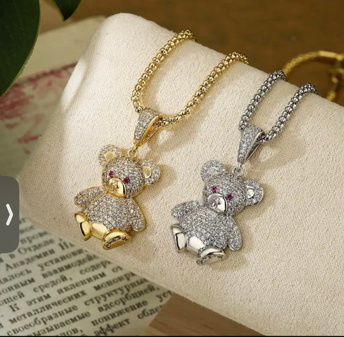 Movable Teddy Bear with a Heart Charms Necklace Gold Plated